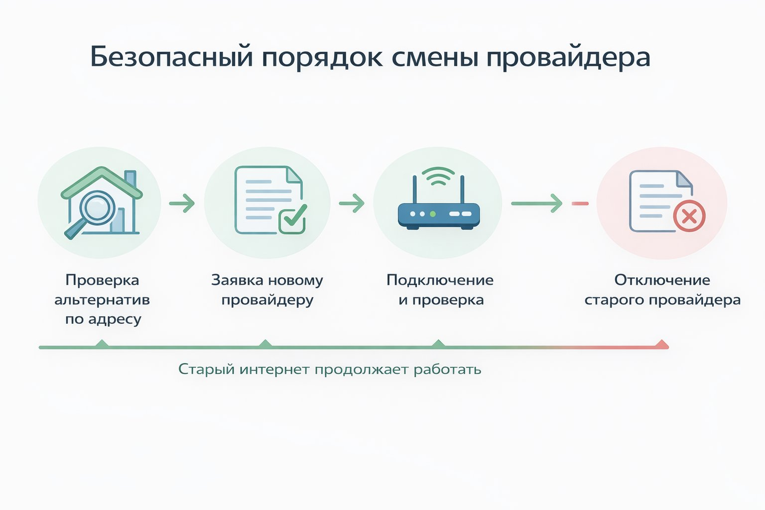 Это главный смысловой блок всей статьи. Правильная последовательность выглядит так: сначала проверить альтернативы и адрес, затем выбрать нового оператора и подать заявку, потом дождаться подключения и проверить работу новой линии, и только после этого завершать отношения со старым провайдером.